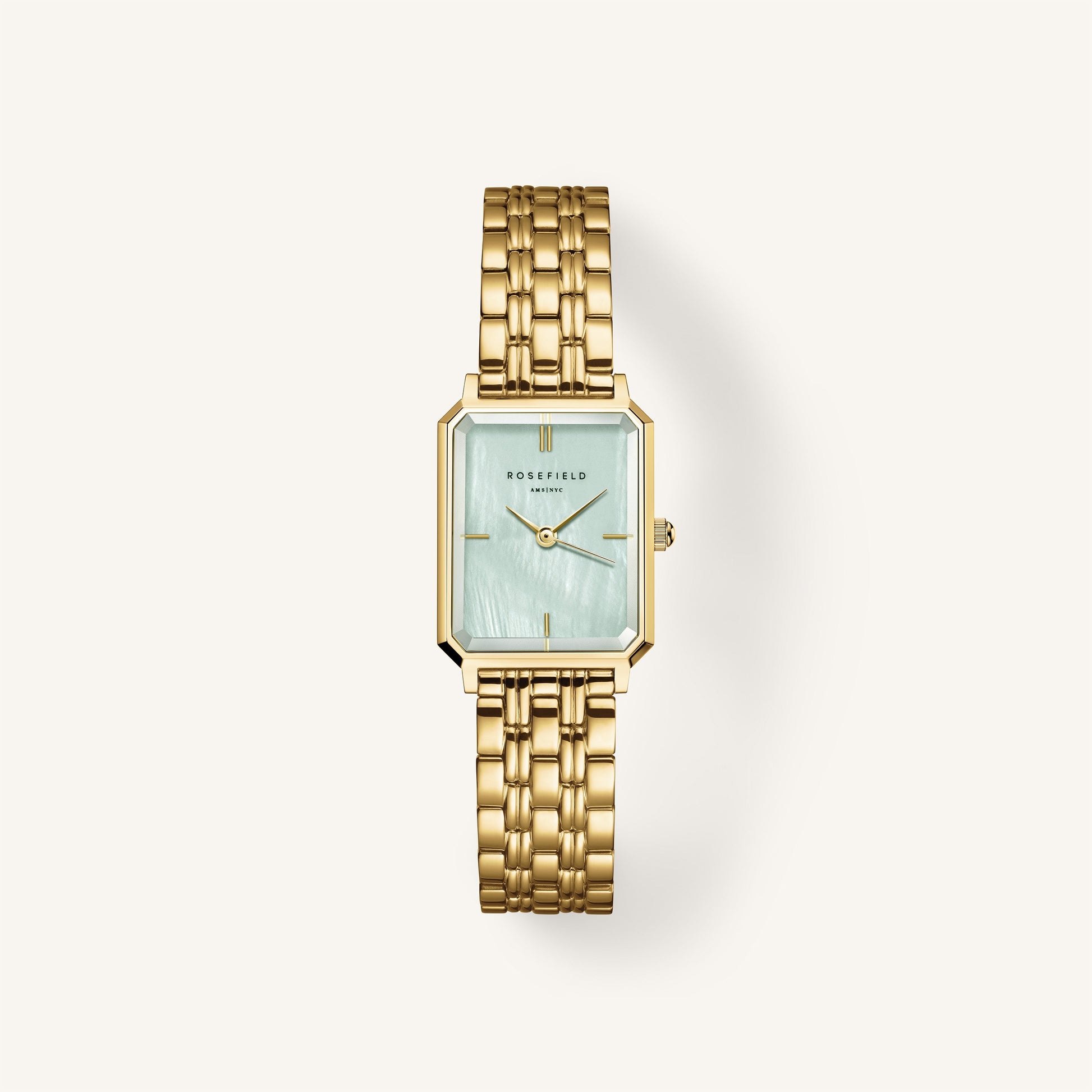 La montre idéale pour un petit poignet avec des détails et une finition exceptionnels. Cadran en nacre vert menthe, verre minéral à facettes 3D et bracelet à 5 maillons.